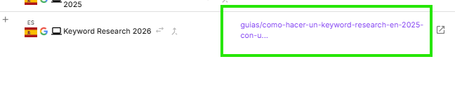 A partir de ese momento, la herramienta empieza a comprobar automáticamente en qué posición apareces para cada término. No solo eso, registra la evolución diaria, detecta si subes o bajas posiciones y muestra qué URL concreta está posicionando. Esto es clave, porque muchas veces no es solo cuestión de ranking, sino de qué página está compitiendo por esa keyword.