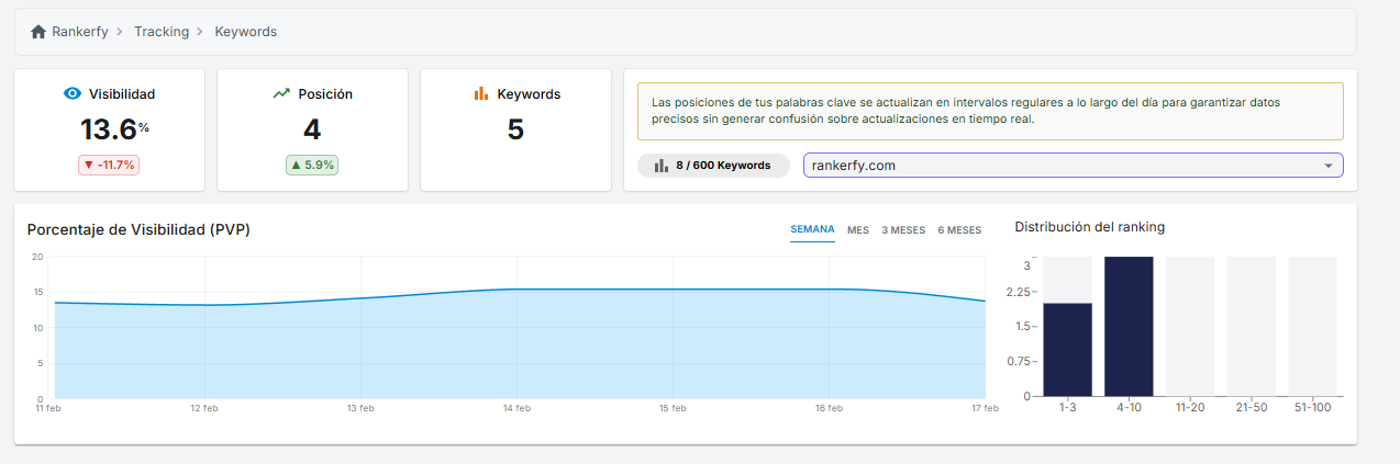Si quieres ver cómo evolucionan tus palabras clave día a día, detectar oportunidades antes que tu competencia y tener un control claro de tu posicionamiento, puedes probar el módulo de seguimiento de posiciones de Rankerfy en tu propio proyecto. En pocos minutos puedes añadir tus keywords estratégicas y empezar a ver movimientos reales.